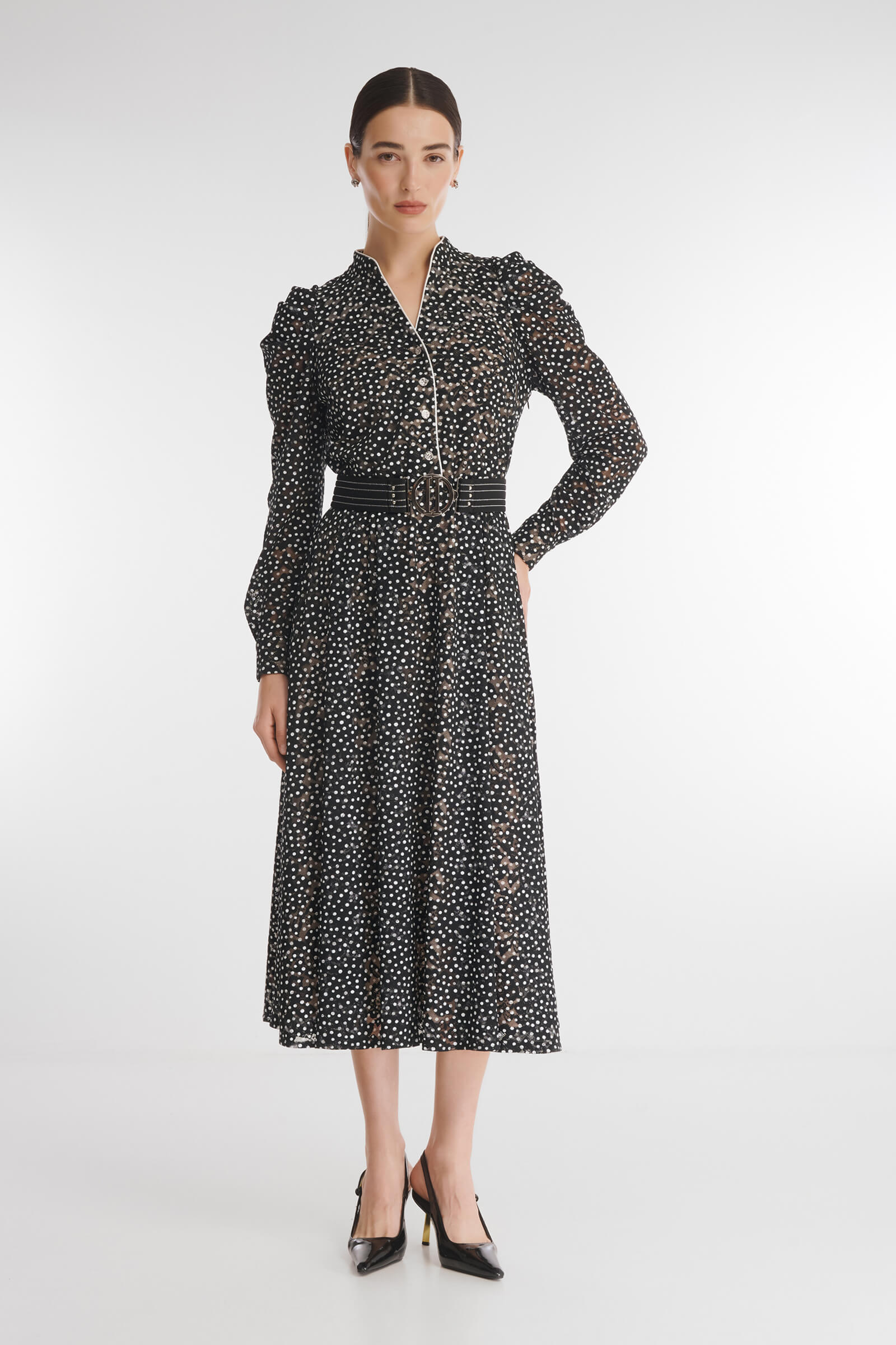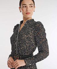 Платье с принтом горох — маст-хэв для создания запоминающегося образа для особого случая. Мастера бренда выполнили модель из утонченного кружева, еще больше подчеркнув нежность и женственность дизайна. Расклешенная юбка и скрытая резинка на талии обеспечивают комфортную посадку для разных типов фигуры.
