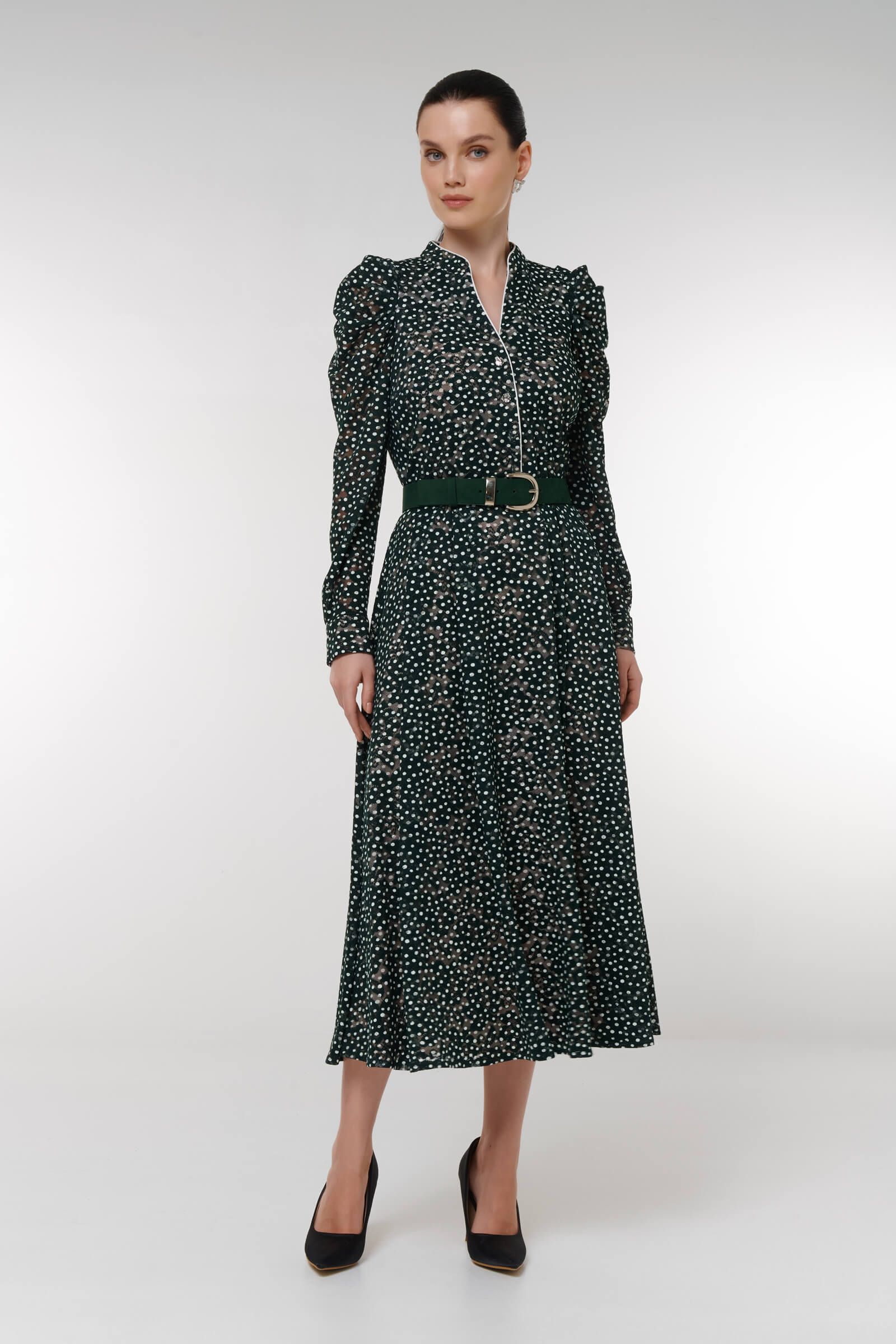 Платье с принтом горох — маст-хэв для создания запоминающегося образа для особого случая. Мастера бренда выполнили модель из утонченного кружева, еще больше подчеркнув нежность и женственность дизайна. Расклешенная юбка и скрытая резинка на талии обеспечивают комфортную посадку для разных типов фигуры.