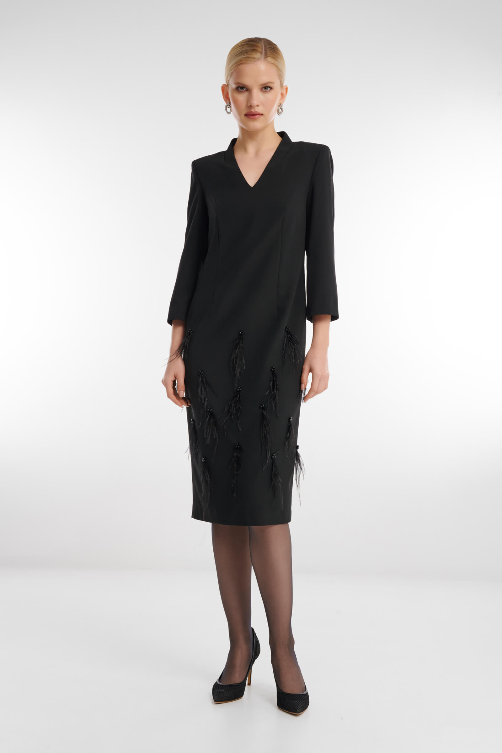 Платье-футляр создано для образов, в которых хочется подчеркнуть элегантность и женственность. Лаконичный силуэт дополнен утончённым декором из перьев, а тонкие подплечники сохраняют стабильную линию плеч и формируют безупречный верх. Универсальная длина делает модель комфортной в сочетании с любой обувью — от изящных каблуков до мягких балеток.