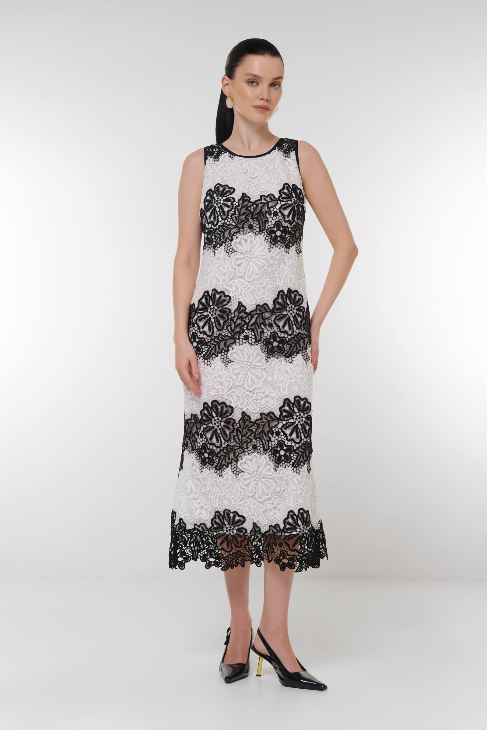 Очаруйте окружающих в этом изысканном платье с вышивкой, идеально подходящем для специальных мероприятий и вечеринок. Уникальный дизайн с прозрачной основой и элегантной черной вышивкой создает романтичный и в то же время современный образ. Облегающее силуэтное платье подчеркивает линии фигуры, а круглой вырез придает изысканность. Сочетайте с туфлями на каблуке и стильными аксессуарами для завершения вашего образа.
