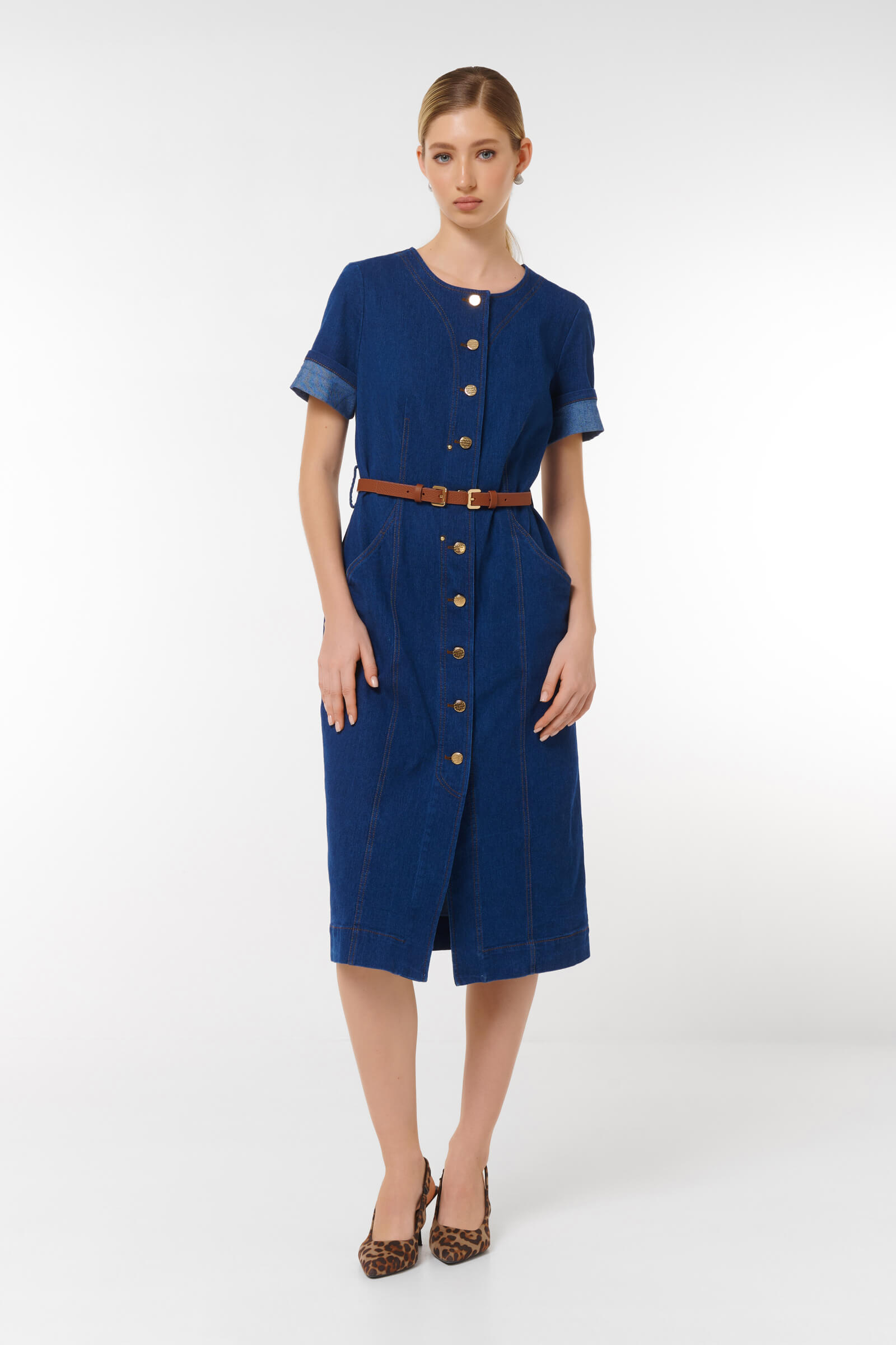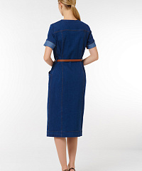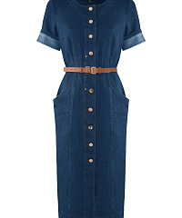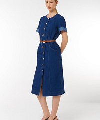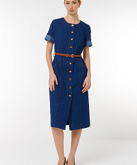 Платье миди из денима. Эта стильная модель с короткими рукавами и застежкой на пуговицы подарит вам комфорт и уверенностьв любом случае. Пояс, который акцентрирует талию,добавляет изящество и делает силуэт более стройным.Идеально сочетается с обувью на каблуке или кроссовками, что позволяет создавать разнообразные образы.