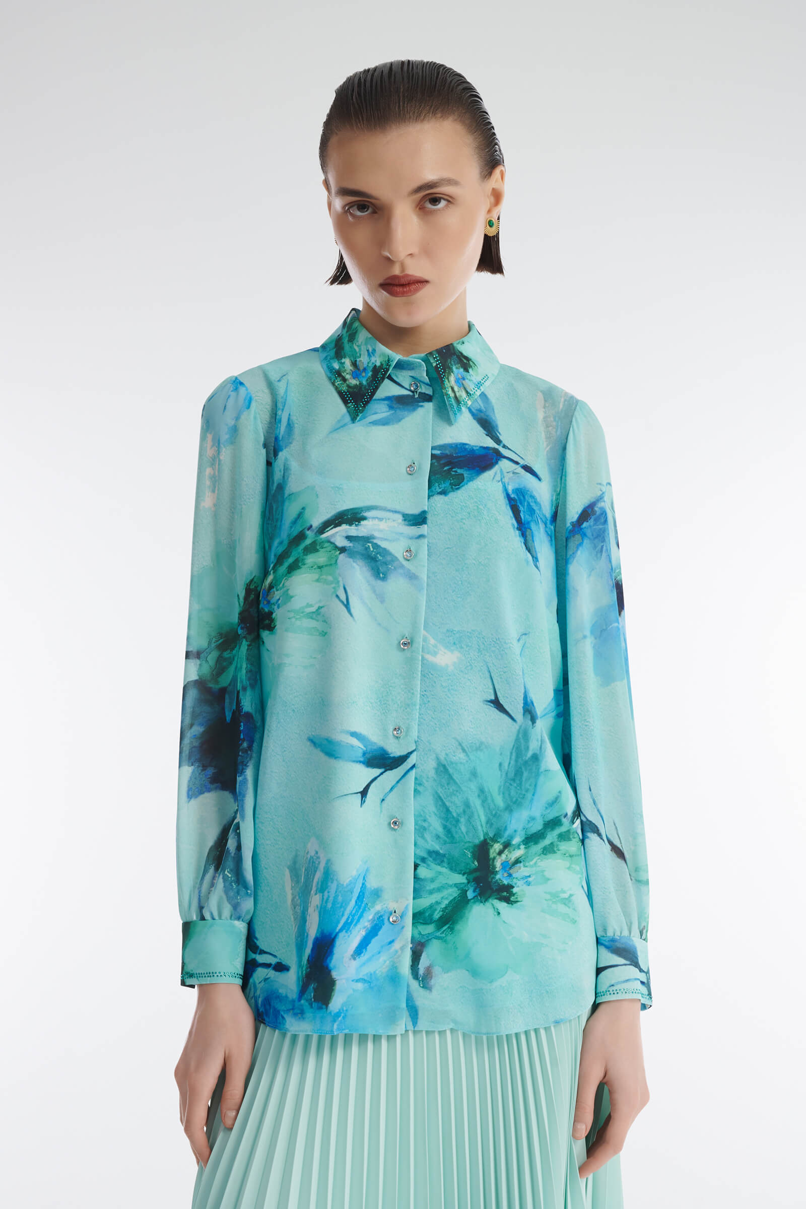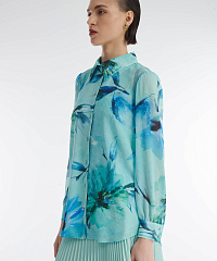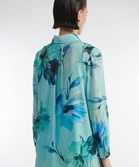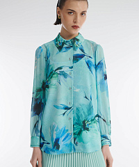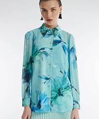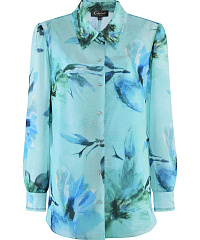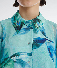 Рубашка из легкого материала на основе вискозы. Классический крой с отложным воротником и рукавами полной длины. Модель декорирована актуальным всегда цветочным принтом и мелкими стразами в тон. Ткань рубашки слегка просвечивает, так что изделие можно стилизовать с подходящей майкой или топом.