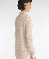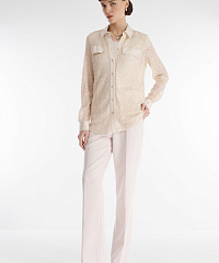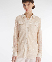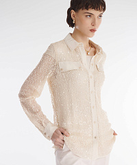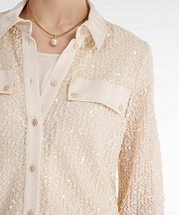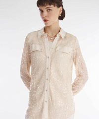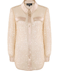 Рубашка из сетки, расшитой пайетками, задаст образу особое настроение. Блеск материала ненавязчиво подчеркнут деталями из атласа. Крой рубашки позволяет дополнить образ нижним слоем в виде топа или выбрать изделие в качестве альтернативы пиджаку или жакету.