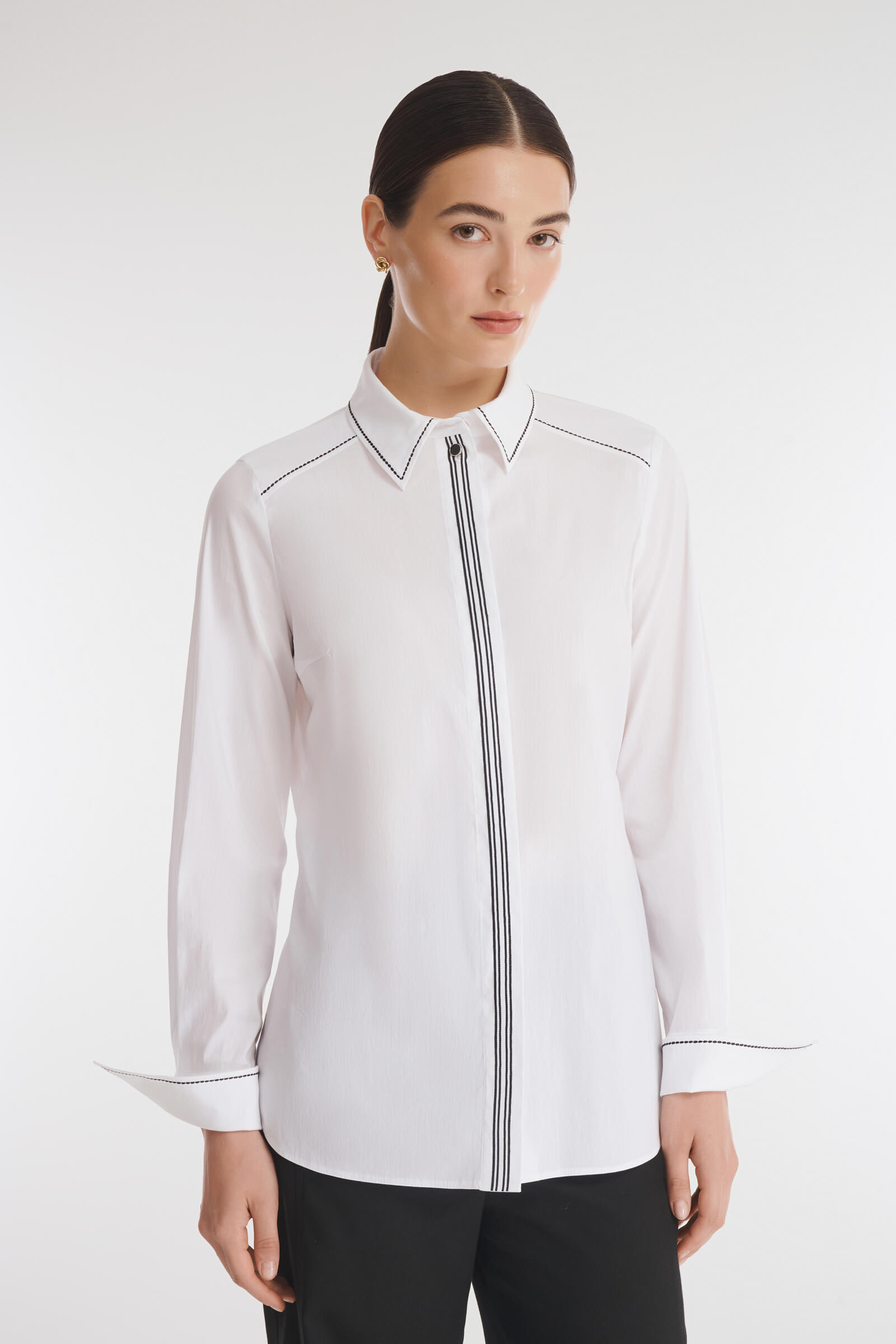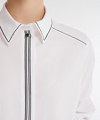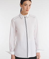 Элегантная рубашка классического кроя. Контрастные детали в виде декоративной строчки расставляют акценты, а тесьма в вертикальную полоску визуально вытягивает силуэт. Эластичный дышащий материал на основе хлопка обеспечивает красивую посадку и комфорт во время носки.