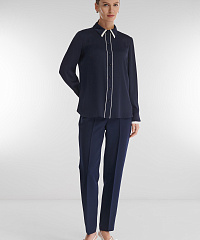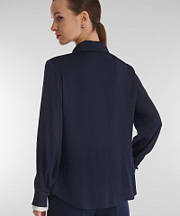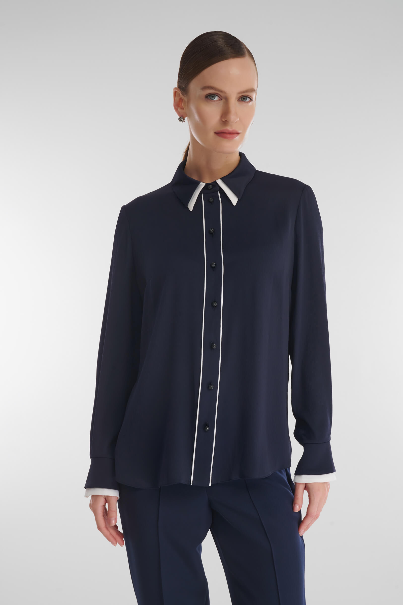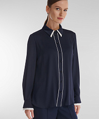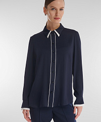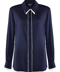 Легкая рубашка с шелковистым блеском и фактурной поверхностью создает утонченный, но выразительный акцент в образе. Контрастная окантовка пуговичной планки и двойной воротник придают модели характер и индивидуальность. Она гармонично сочетается с классическими брюками и юбками-карандаш, а в паре с джинсами или широкими брюками образует расслабленный, но безупречно стильный ансамбль.