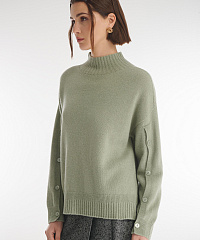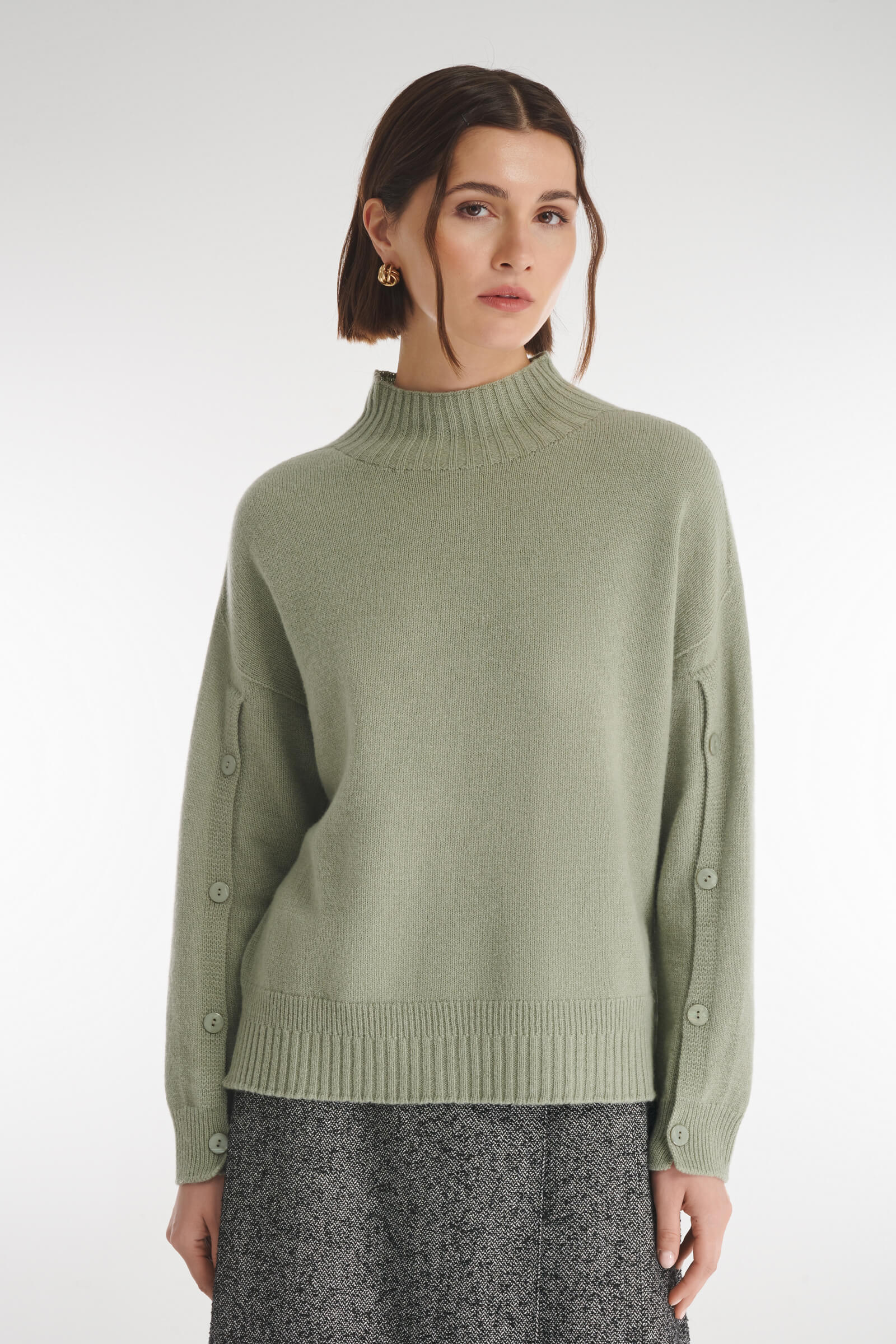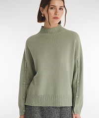 Смесь натуральной шерсти и кашемира делает свитер свободного кроя маст-хэвом зимнего гардероба. Рукава изделия дополнены высокими разрезами на пуговицах, которые становятся не только декоративной деталью, но и функциональной фишкой, позволяющей продемонстрировать многослойность образа.