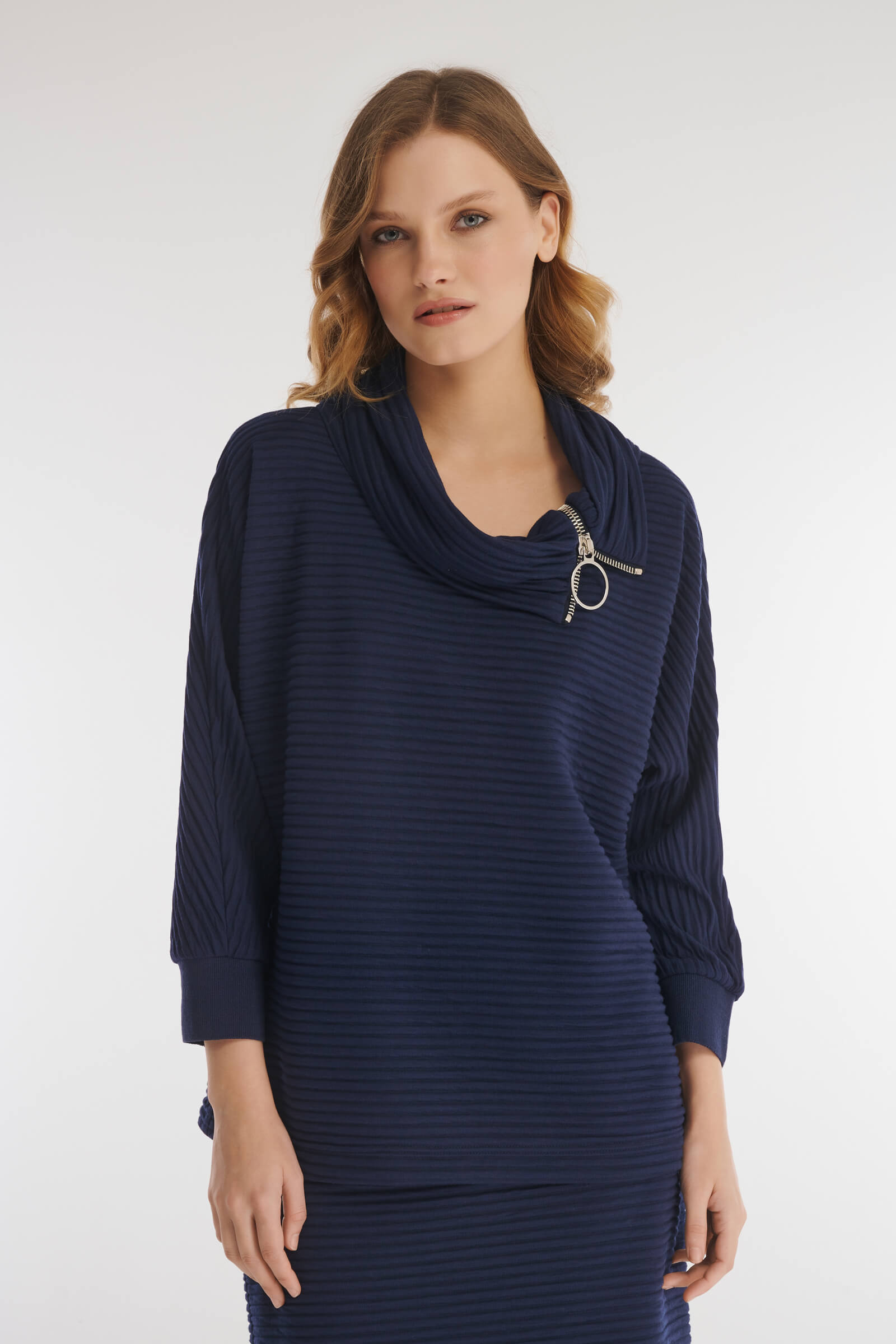 Свитшот с воротником на молнии и рукавом «летучая мышь» — стильная и универсальная вещь, которую получится комбинировать множеством способов. В офис модель можно носить с прямыми или широкими брюками или с юбкой-карандашом. С любимыми джинсами и ботинками свитшот будет незаменим для прогулки или шопинга. С юбкой длины миди и ботильонами на каблуке изделие можно надеть на романтическую встречу. Идеальную пару модели придумали дизайнеры Caterina Leman — это юбка в тон из той же линейки, поэтому создать гармоничный образ не составит труда.