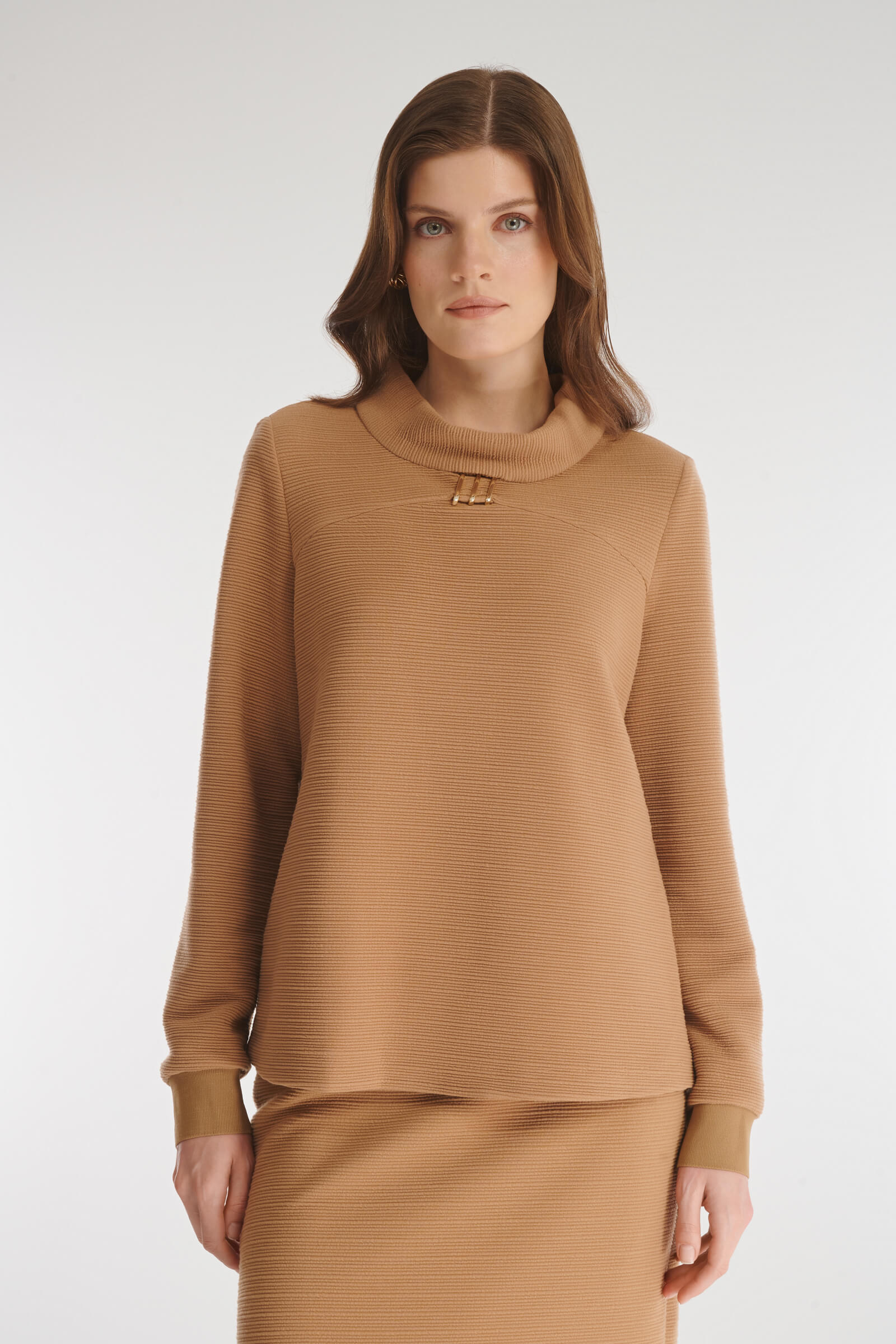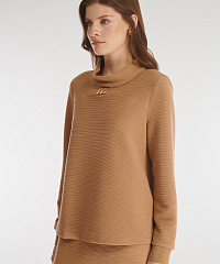 Свитшот с воротником-воронкой выполнен из фактурного материала на основе вискозы. Манжеты на резинке обеспечивают комфортную посадку рукавов. Мастера бренда украсили модель декоративной фурнитурой, сделав дизайн более нарядным и эффектным.