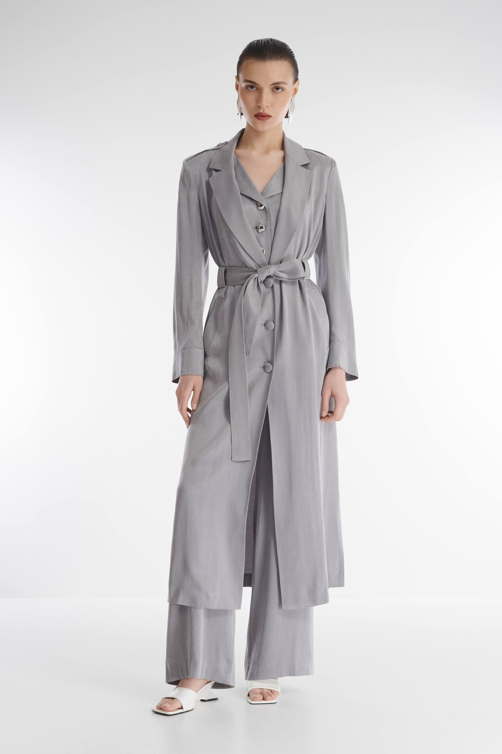 Элегантная туника с английским воротником. Длина мидакси и удобные боковые разрезы для комфорта во время носки. Для создания изделия был выбран материал из 100% вискозы — легкий, струящийся и с благородным блеском.