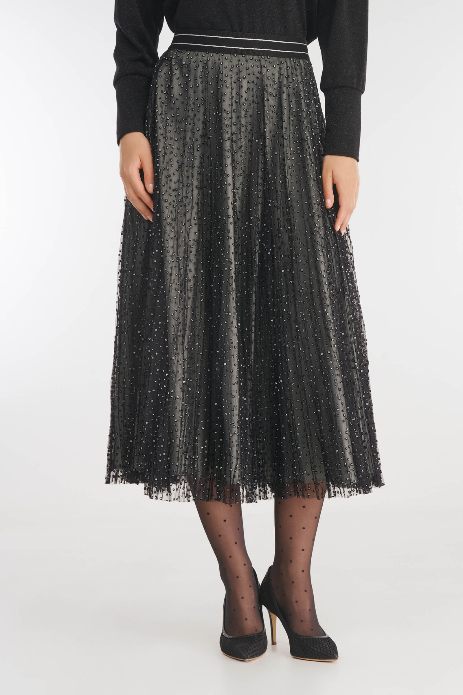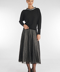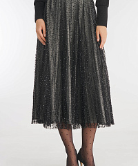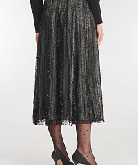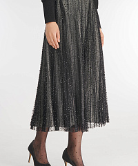 Роскошная плиссированная юбка — для запоминающихся образов. Верхний слой из прозрачного тюля с мерцающим узором, издалека напоминающим россыпь страз, отвечает за динамику силуэта и приковывает к себе взгляды окружающих. Продуманный крой с удобным поясом на резинке и скрытой застежкой гарантирует комфортную посадку.