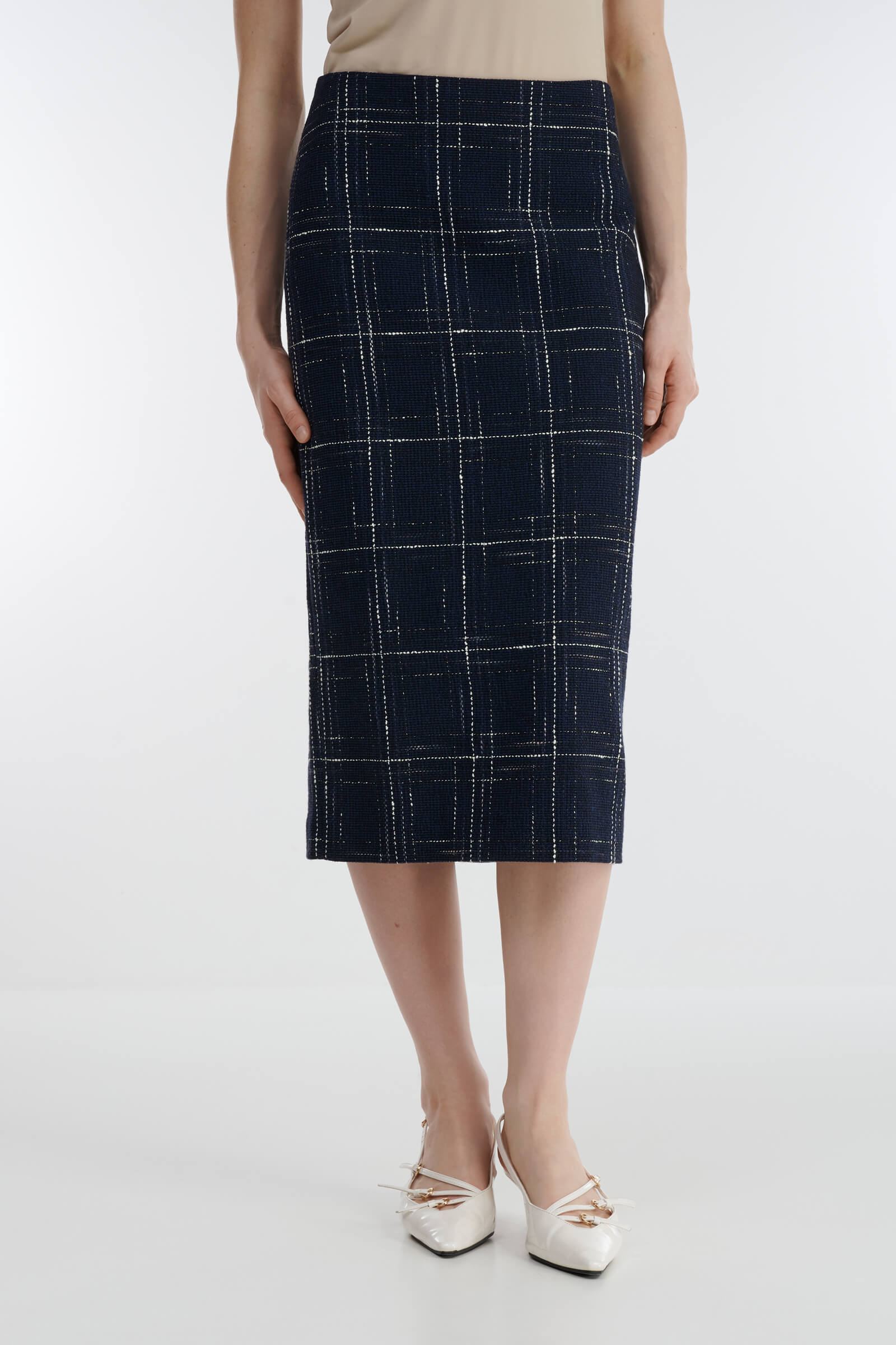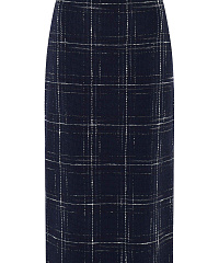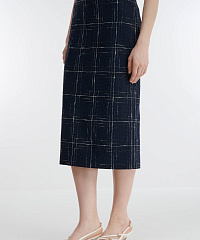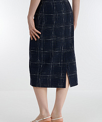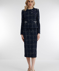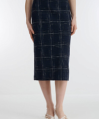 Прямая юбка подчеркивает стройность бедер, плотно облегая фигуру. Динамичности модели придает рисунок, напоминающий тонкую штриховку, нанесенную пунктиром. С юбкой можно составить нарядные и повседневные комплекты, а завершенный образ складывается с укороченным жакетом с изысканной отделкой из той же линейки.