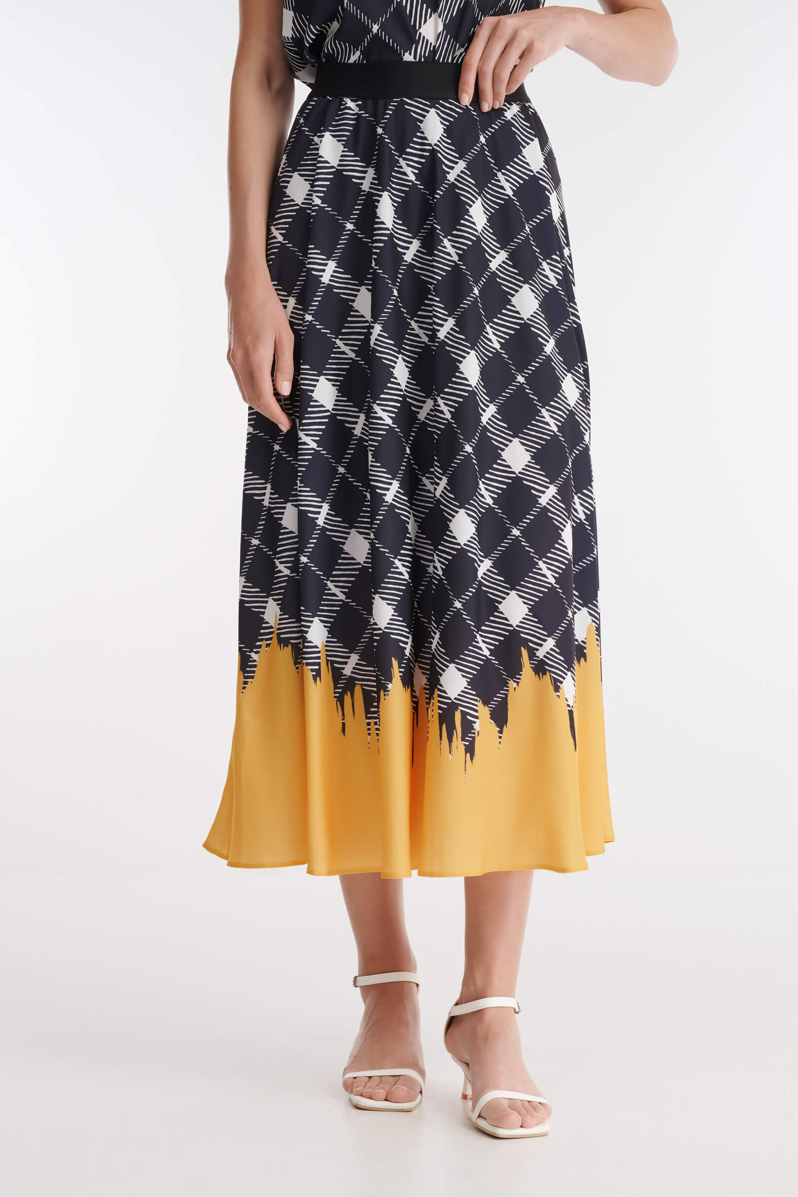 Расклешенная юбка выполнена из легкого струящегося материала на основе вискозы с эффектным комбинированным принтом. Эластичный пояс на резинке гарантирует оптимальную посадку и комфорт. Сочетайте юбку с топом из той же линейки для создания яркого и динамичного тотал-лука.