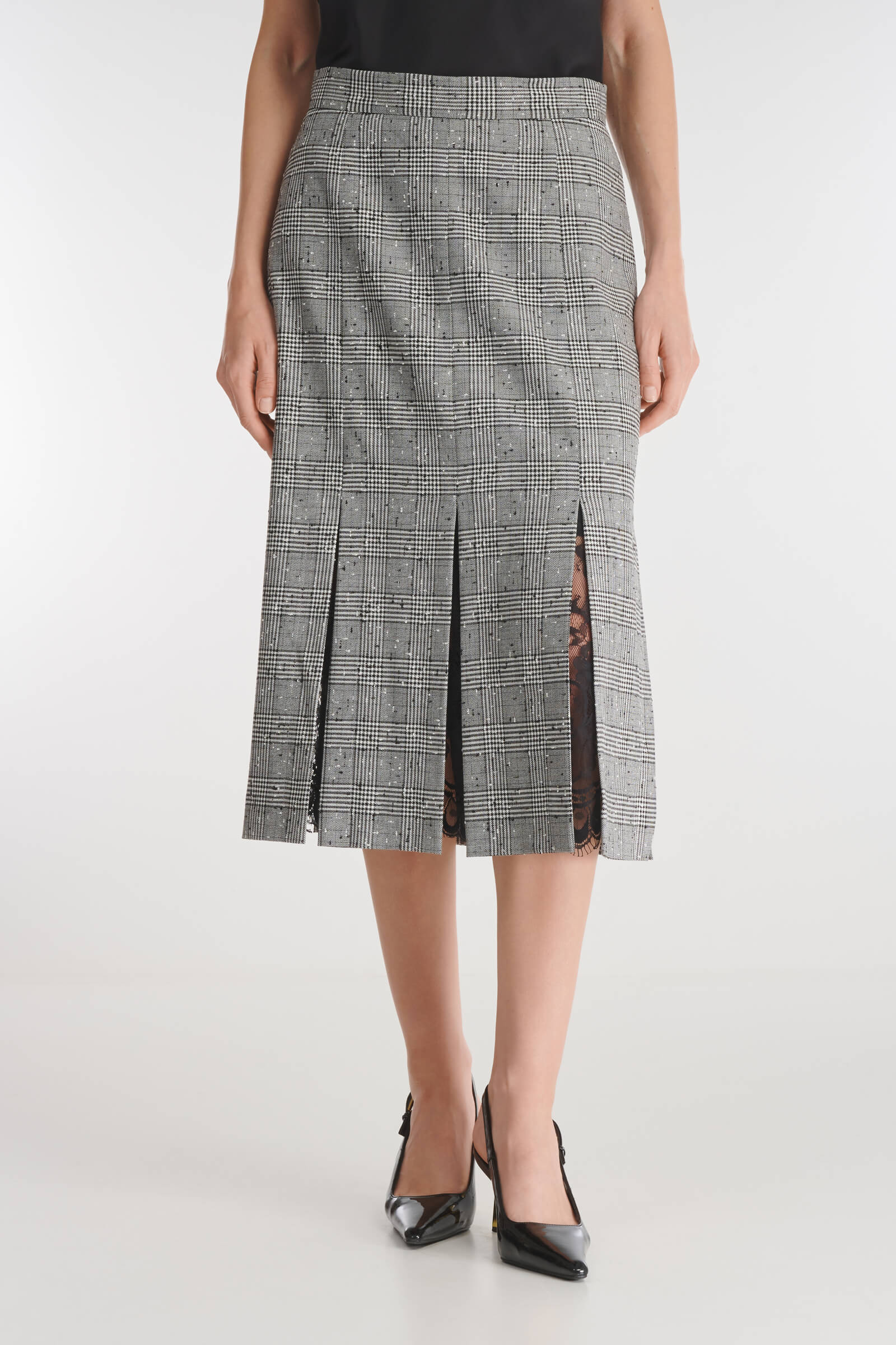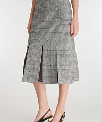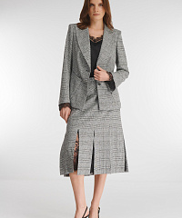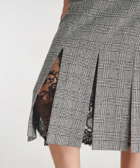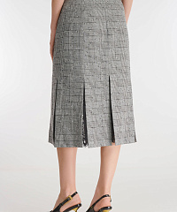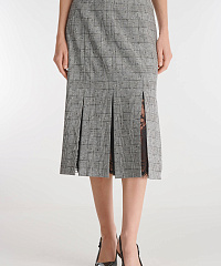 Юбка универсальной длины выполнена из легкой фактурной ткани в небольшую крапинку. Одновременно элегантный и женственный дизайн сочетает классический узор в клетку и тончайшее фестончатое кружево. Модель составит гармоничную пару как с обувью на каблуке, так и на плоском ходу. Дополнить образ с юбкой можно пиджаком из той же линейки.