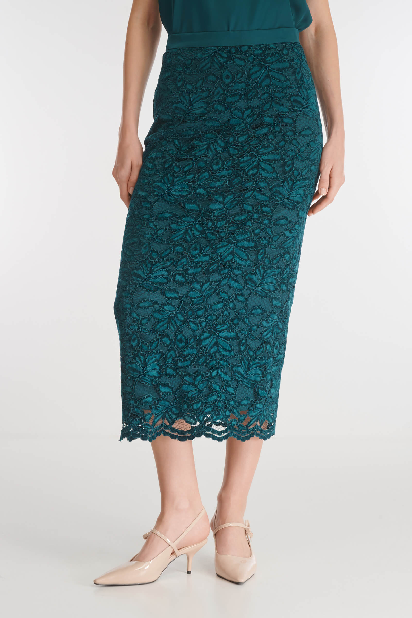 Юбка-карандаш выполнена из нежного гипюра с флористичным мотивом. Узкий атласный пояс подчеркивает благородный дизайн. Модель застегивается на скрытые молнию и пуговицу на спине. В комплект к юбке можно подобрать жакет из той же линейки.