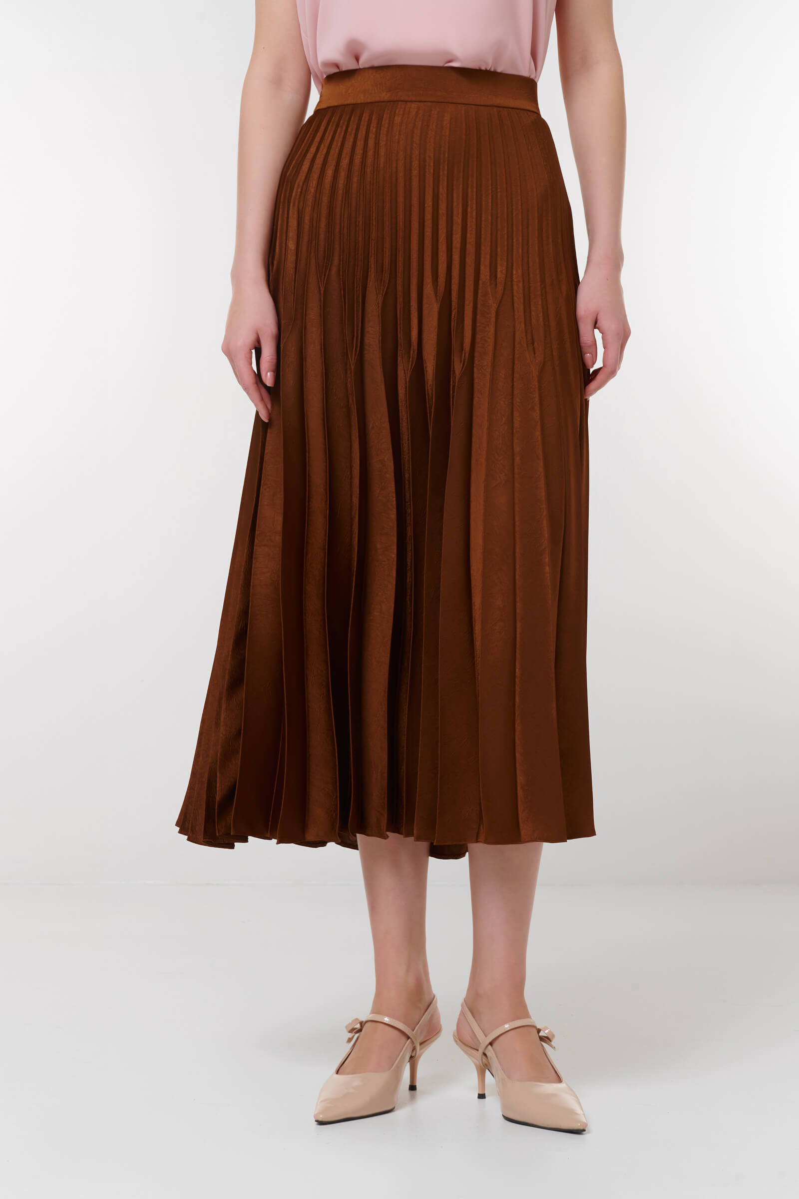 Для создания плиссированной юбки был выбран материал на основе вискозы, который отлично сохраняет форму. За стабильность силуэта и красивый объем отвечает подкладка, дополненная специальными оборками из тюля. Пояс на резинке обеспечивает комфортную посадку.