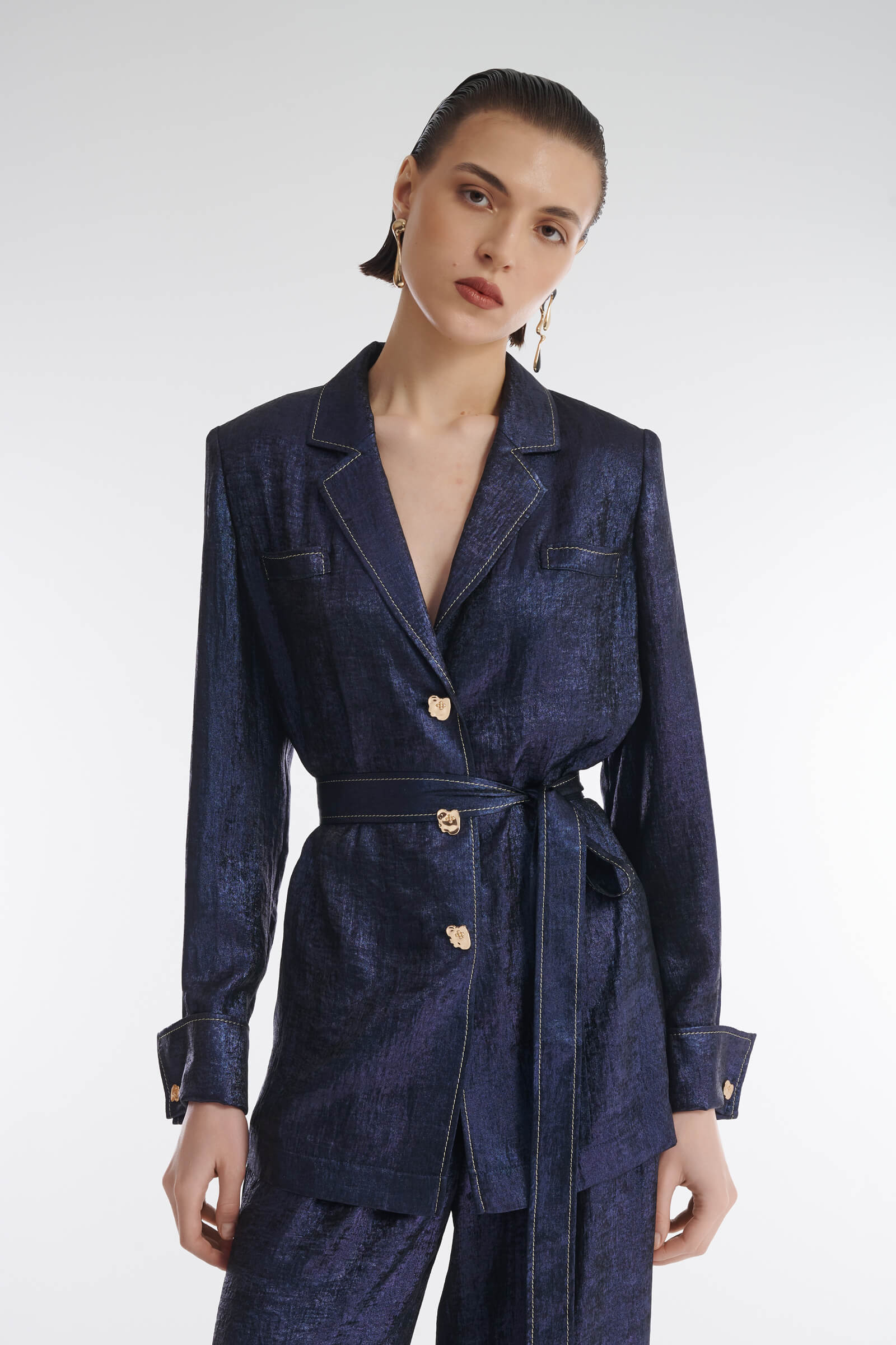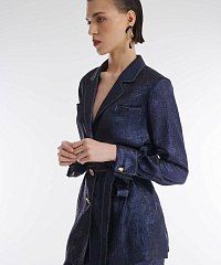 Жакет в пижамном стиле с английским воротником. Модель подойдет для создания как элегантных, так и расслабленных образов. Контрастная декоративная строчка и пуговицы становятся акцентными деталями дизайна изделия. Подплечники подчеркивают линию плеча. Сочетайте жакет с брюками из той же линейки для создания готового комплекта.