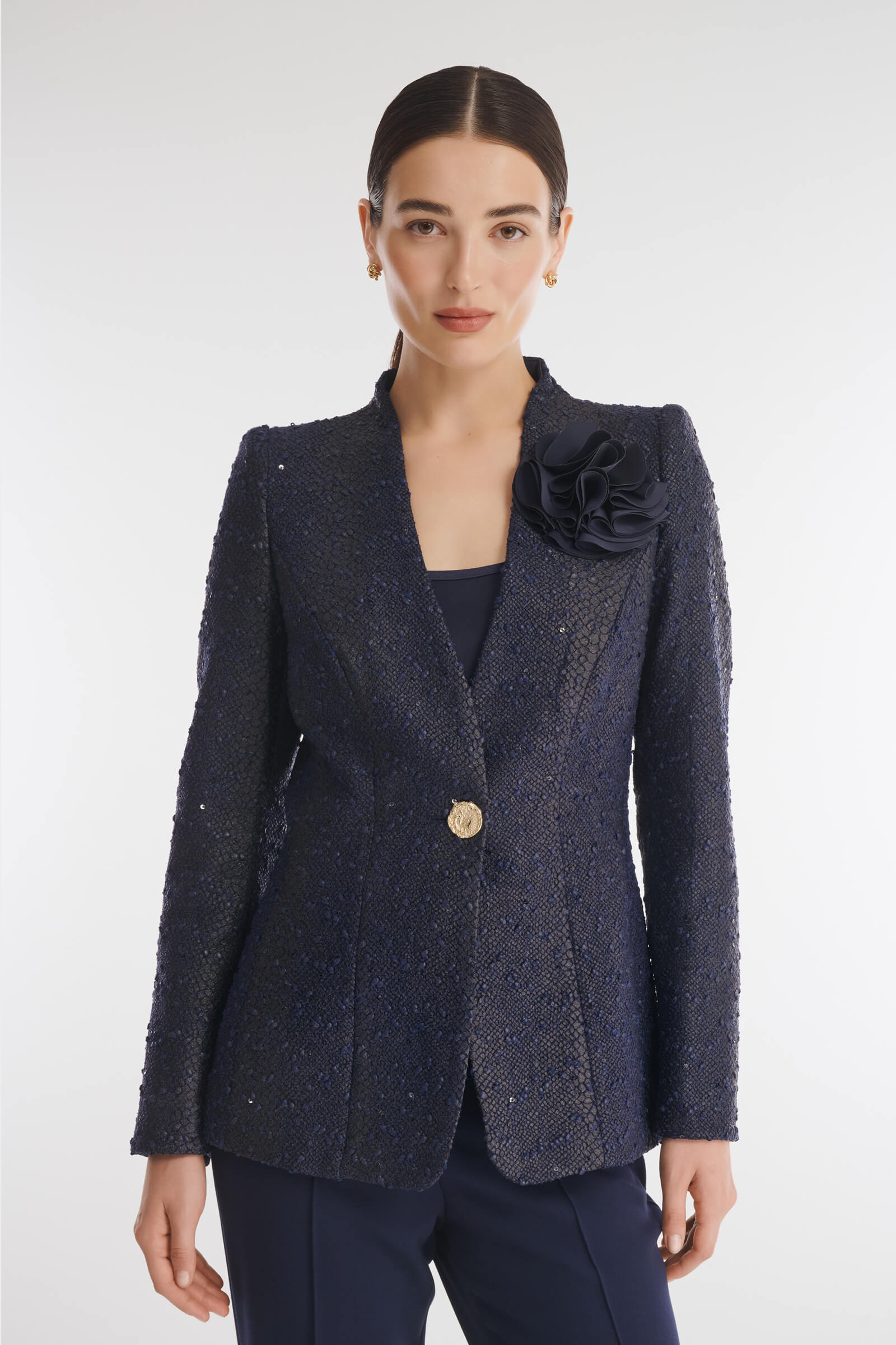 Для создания жакета был выбран фактурный материал с имитацией анималистичного узора, который заметен при ближайшем рассмотрении. Небольшие пайетки игриво мерцают под разными углами освещения, добавляя образу динамики. Жакет идеально впишется как в повседневные аутфиты с джинсами, так и в элегантные вечерние наряды.