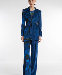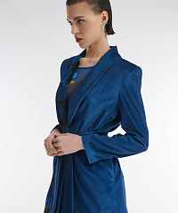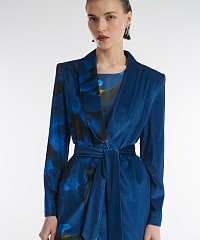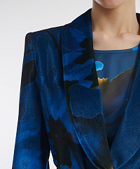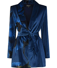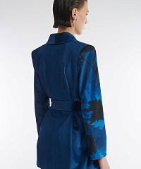 Удлиненный жакет из мягкого бархата. С одной стороны изделие декорировано цветочным принтом. Застежка на скрытые кнопки не отвлекает от дизайна. Пояс в тон позволяет подчеркнуть талию. Сочетайте жакет с брюками из той же линейки, струящимся платьем-комбинацией или элегантной однотонной юбкой.