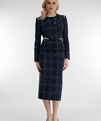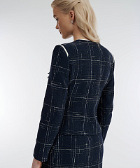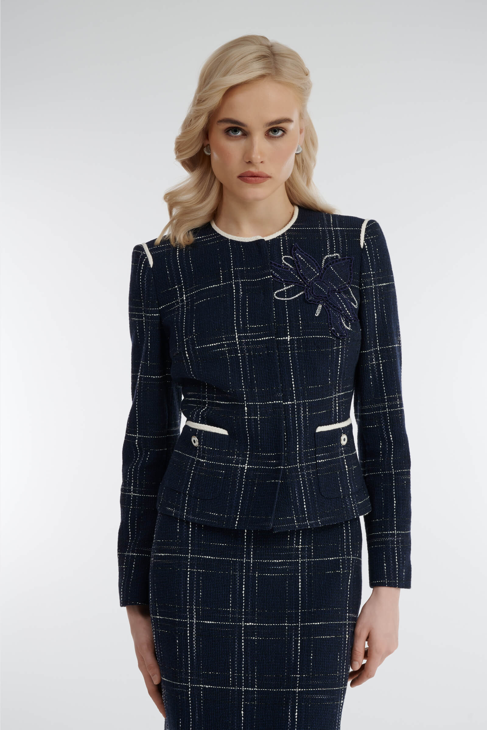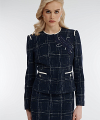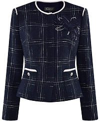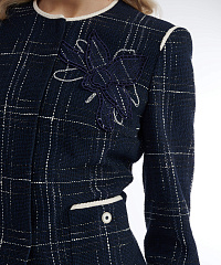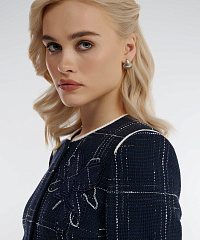 Элегантный укороченный жакет сразу привлекает внимание такими деталями, как отделка контрастным по цвету плетеным шнуром и вышитой аппликацией на груди. Благодаря декору жакет можно надевать в особо торжественных случаях.