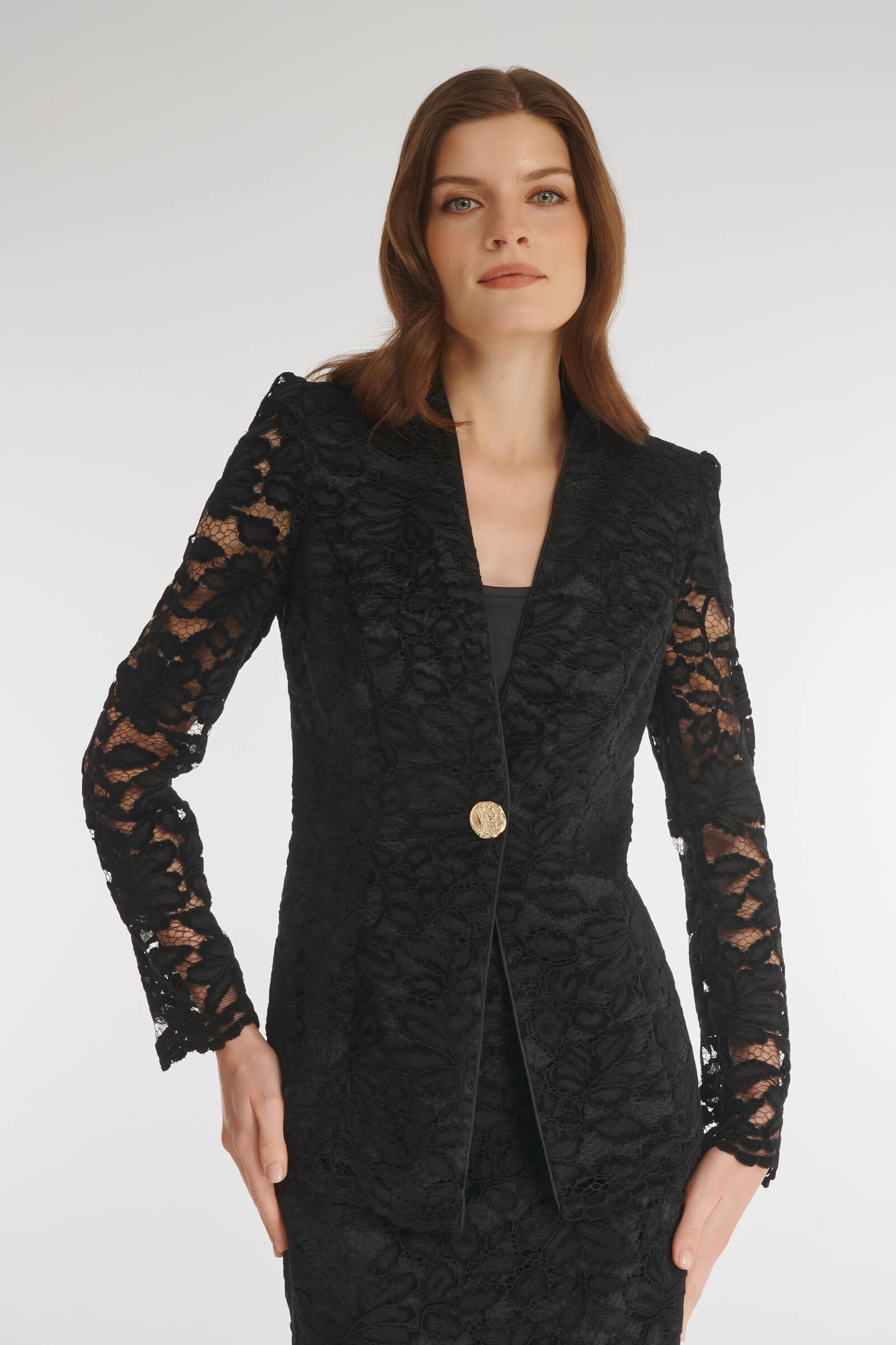 Жакет из нежного гипюра с флористичным мотивом. Крой акцентирует внимание на талии. V-образный вырез визуально вытягивает силуэт. Полупрозрачные рукава подчеркивают легкость. В комплект к жакету можно подобрать юбку из той же линейки.