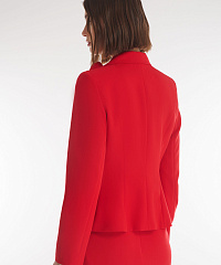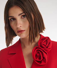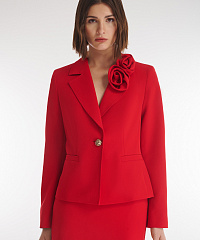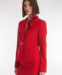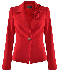 Наполните свои образы женственностью с элегантным приталенным жакетом. Модель застегивается на контрастную пуговицу в форме розы. Объемный цветочный декор украшает классический английский воротник. Модель выполнена из плотного костюмного материала на основе вискозы, подплечники помогают поддерживать форму изделия. В комплект к жакету можно подобрать юбку в тон из той же линейки.