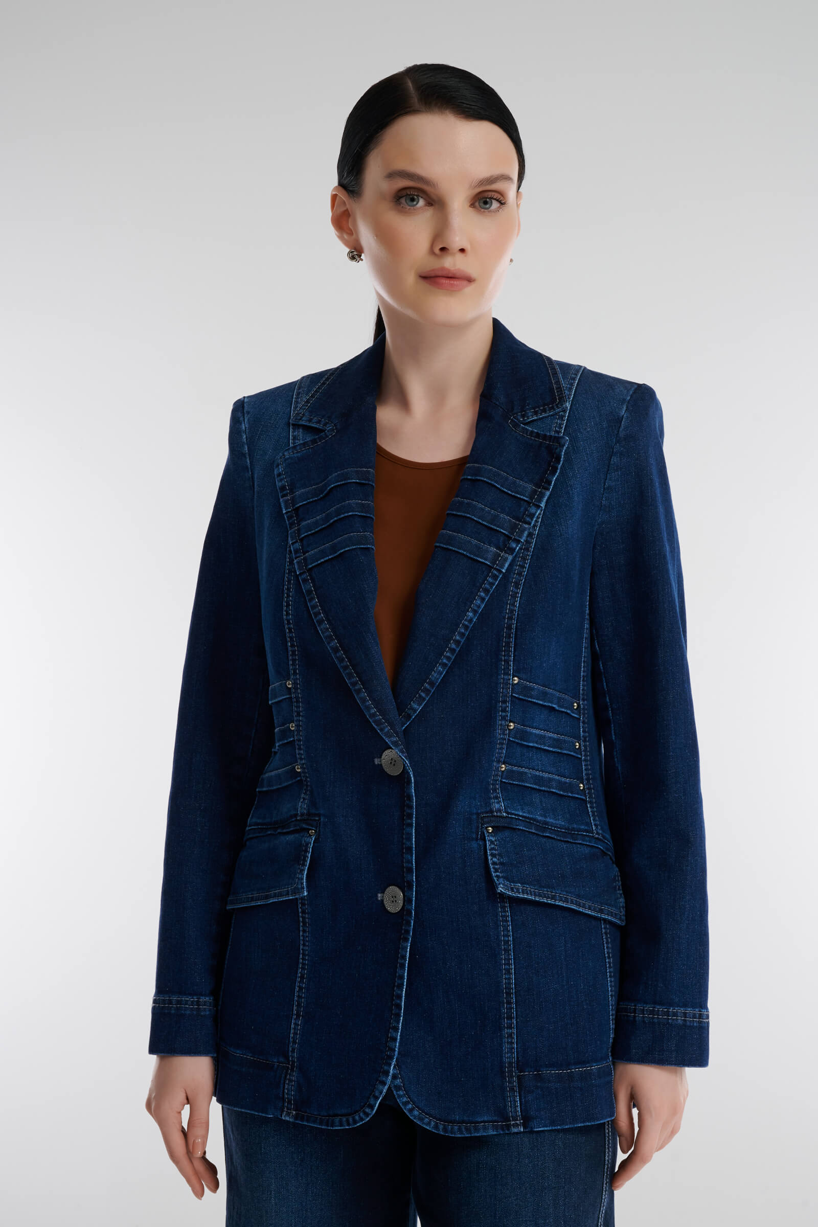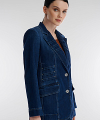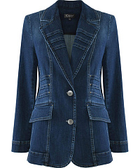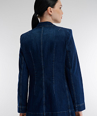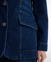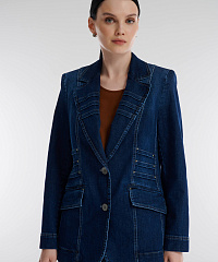 Жакет из денима станет выразительным элементом повседневного гардероба. Полуприталенный крой выгодно подчеркивает фигуру, а контрастная строчка и декоративные складки придают модели оригинальность. Носите жакет с романтичными платьями или дополните его джинсами из той же линии для создания модного тотал-лука.