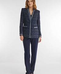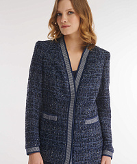 Для создания жакета был выбран красивый фактурный материал из поливискозы, украшенный люрексом и пайетками. Дизайн позволит носить изделие с денимом — днем или стилизовать в вечерние сеты с атласом и кружевом. Жакет застегивается на скрытые кнопки. Подплечники поддерживают форму изделия.