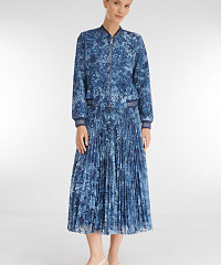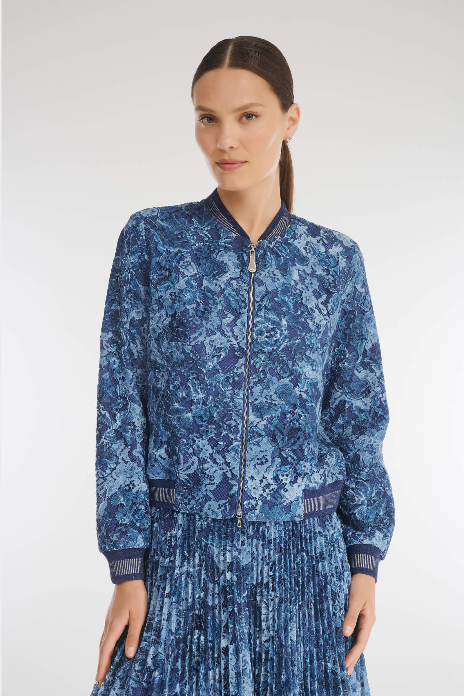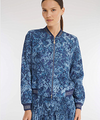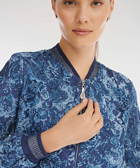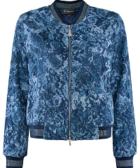 Укороченный бомбер на молнии. Особый шарм модели придает нежный гипюр с цветочным мотивом, выбранный дизайнерами для создания изделия. Классический фасон и трикотажные детали делают бомбер универсальным дополнением как образа в стиле кэжуал, так и наряда для особого случая.