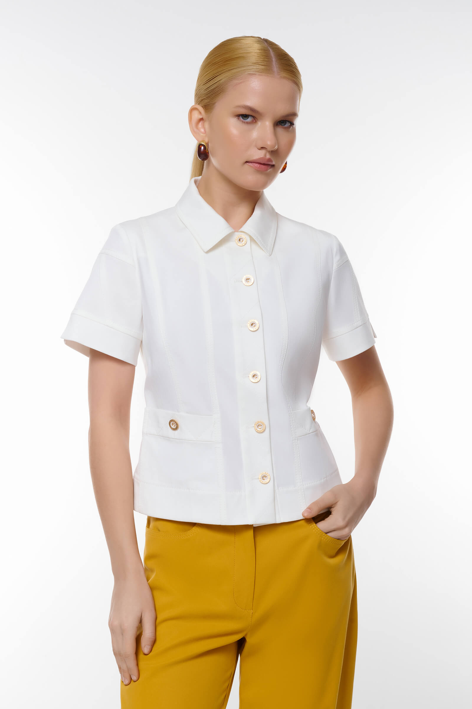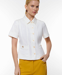 Это стильный жакет с приталенным кроем подчеркивает достоинства фигуры, а короткие рукава добавляют легкость и комфорт. Декорированный пуговицами с декоративными элементами, жакет прекрасно дополняет как классические, так и повседневные образы. Два боковых кармана не только практичны, но и добавляют стильный акцент. Сочетайте его с юбками, брюками или шортами для создания модного и изысканного образа.