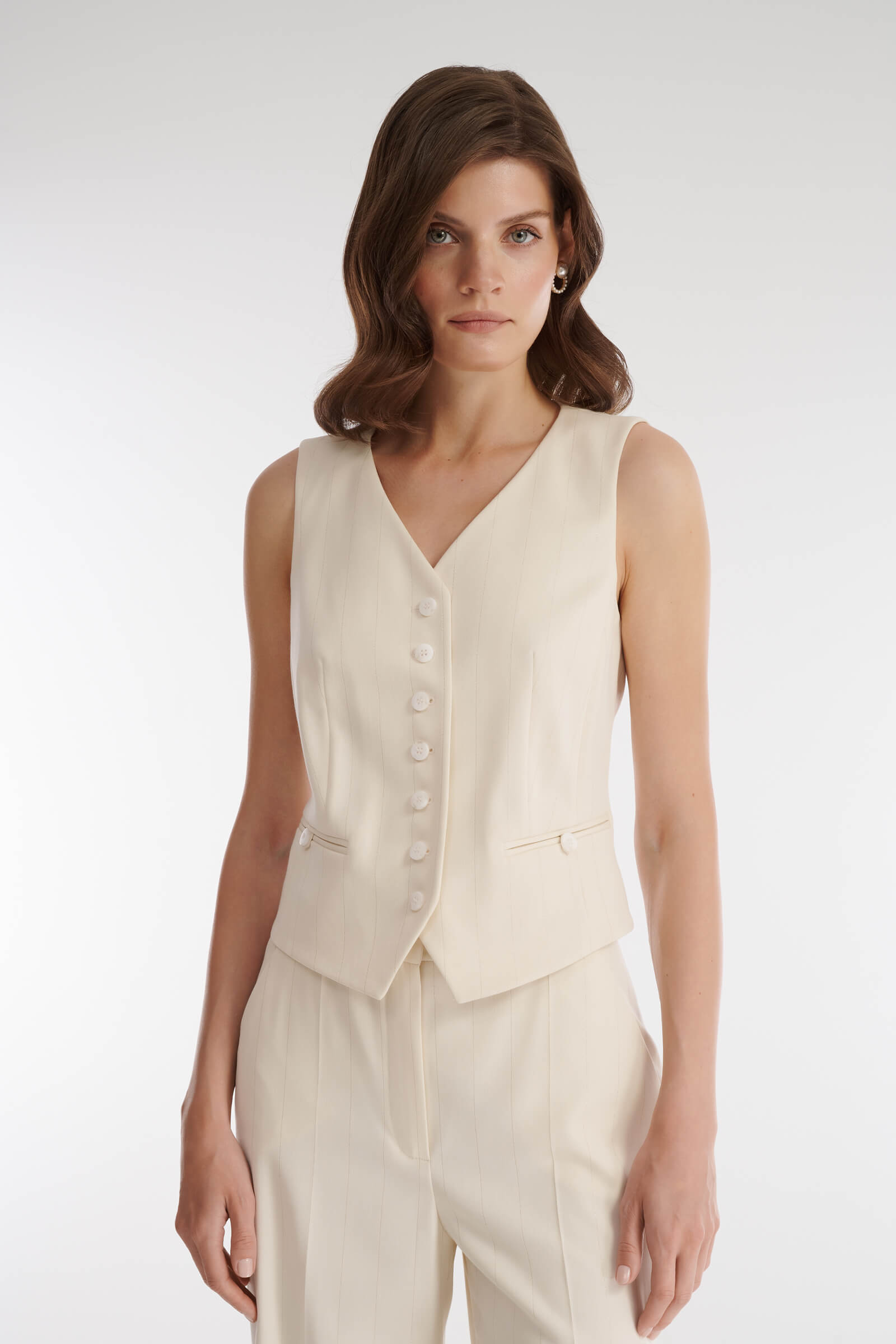 Жилет в полоску — универсальный вариант для создания различных образов. Благодаря использованию люрекса, который делает дизайн менее формальным, он составит гармоничную пару как с брюками в тон из той же линейки, так и с голубыми джинсами или однотонной атласной юбкой. V-образный вырез позволяет дополнить наряд украшением на шею.